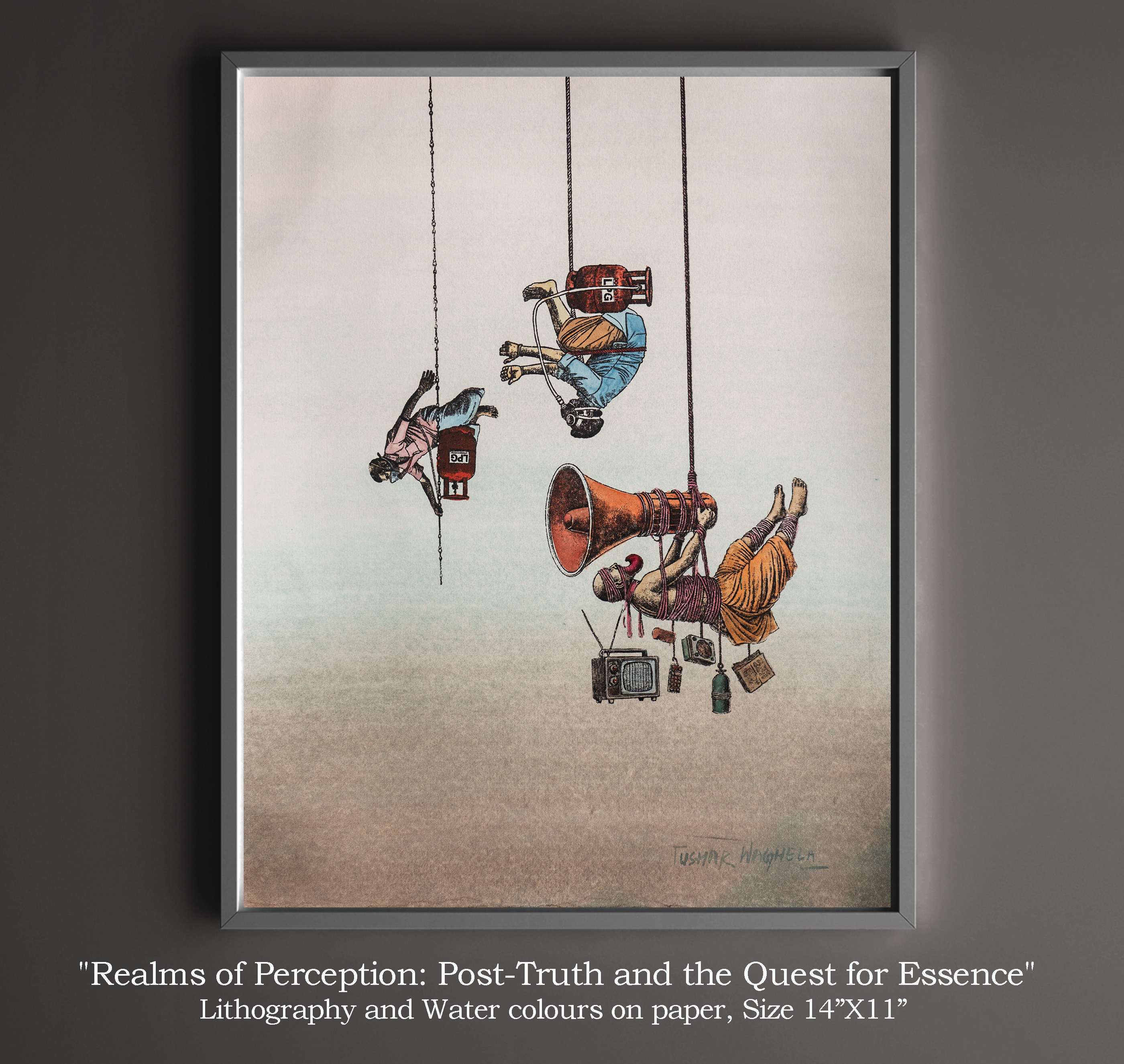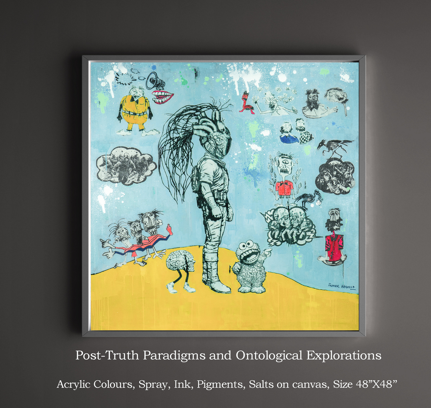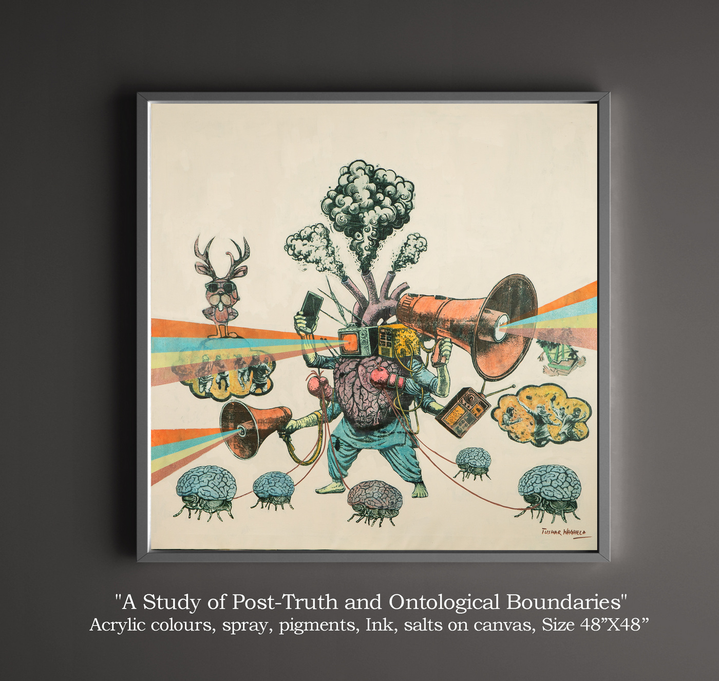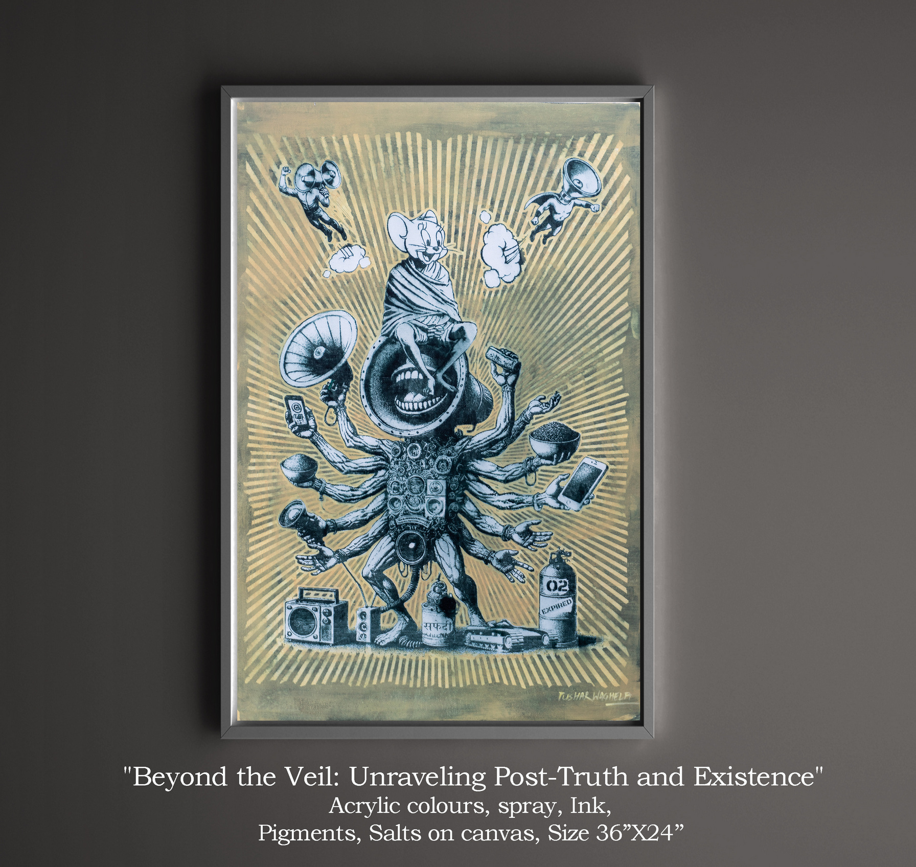 The fundamental concept of my art is to explore the post-truth behaviours of society, which include altered information, conflicts between the heart and mind, and our cultural teachings and discipline. By peeling back the layers of society, I uncover the bizarre undercurrents flowing through our modern society. This exploration not only challenges the ontological understanding of being and existence in an affected reality but also raises questions about the epistemological foundations—how we know what we know, and what is deemed as truth in a post-truth era.