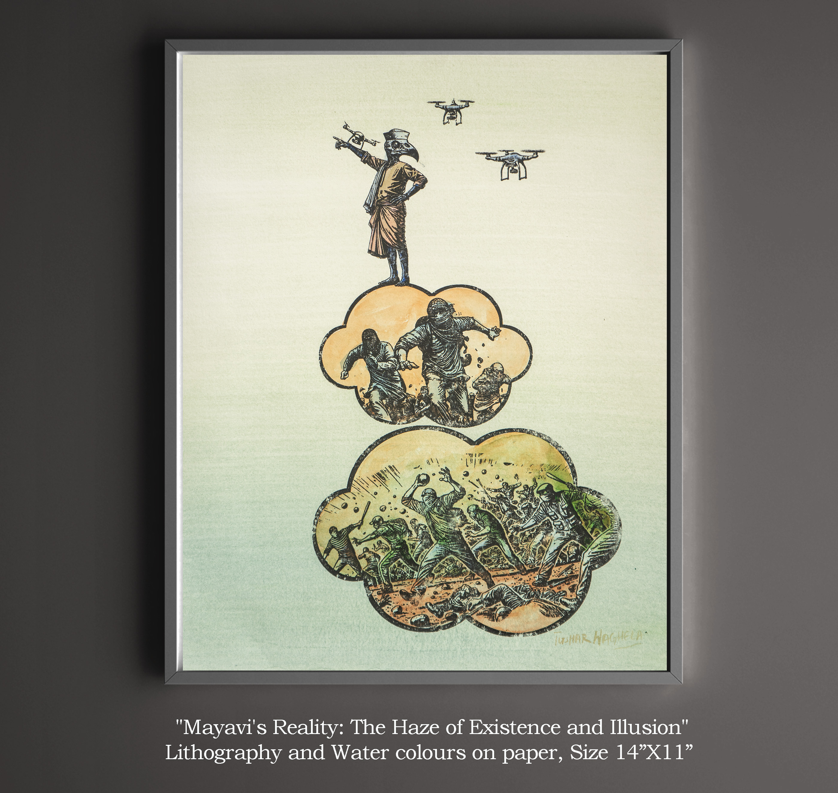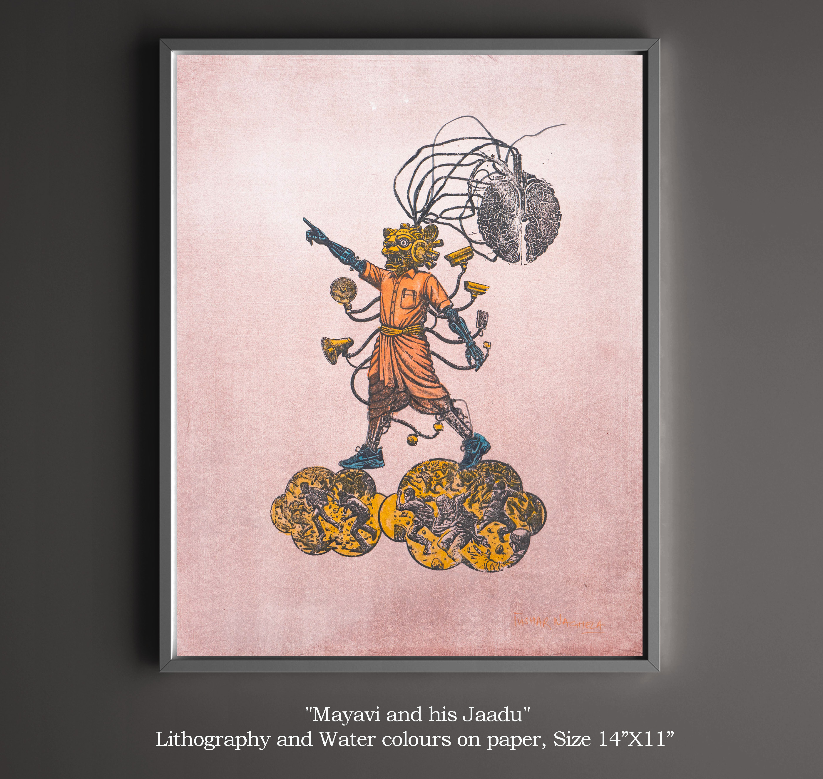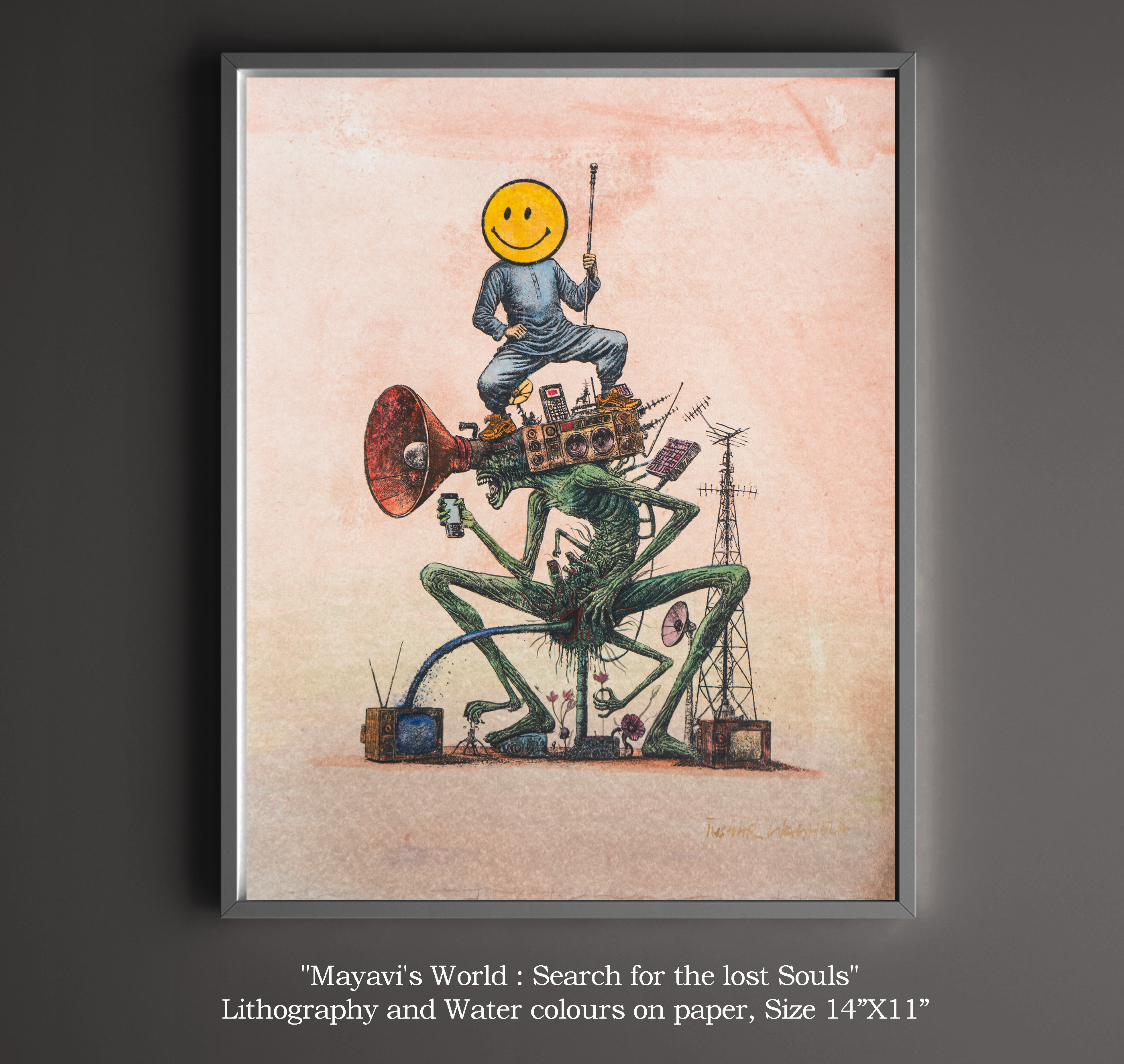 In this series, I depict the transformation of human personalities into terrifying, hybrid, and bizarre forms under the influence and pressure of socio-political conditions. These characters, both evolved and semi-evolving, are portrayed with a mix of satire, humour, and other emotions, which reflect the complex interplay between their minds and hearts. This creates a unique blend of the ordinary and the extraordinary.